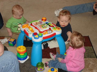 Yesterday we went to a friend's house for a surprise birthday party. There were lots of kids there, including Corin's best buddy John. Corin enjoyed playing with John (and all of his toys). He mastered holding himself up to play, which we were very excited about. He, on the other hand, was very excited about the ice cream that his mother gave him.
